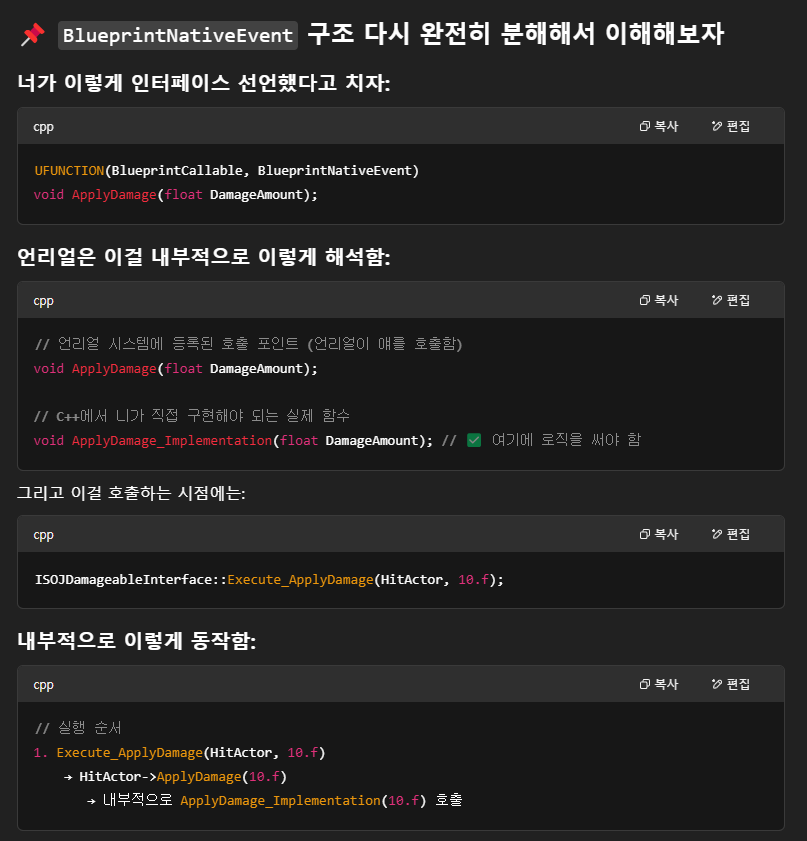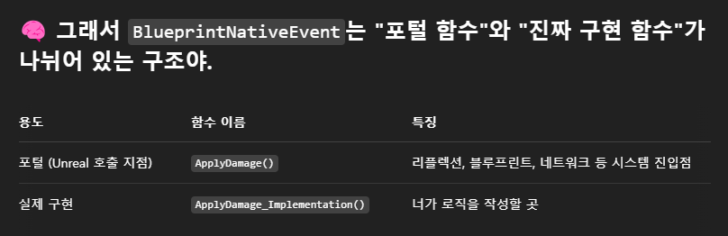 - BlueprintNative 라고 선언한 이상, 언리얼 엔진은 "이 함수는 Native 구현이 _Implementation() 안에 있을 거다" 라고 확실히 못박아 둔 상태임