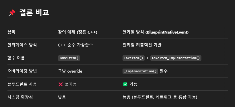 - 블루프린트에서 함수를 사용하지 않을거라면 이 방식으로 가상함수로 선언한 후에, 이 인터페이스를 상속받은 클래스에서 _Implementation 없이 그냥 일반적인 함수 이름을 그대로 override해도 됨