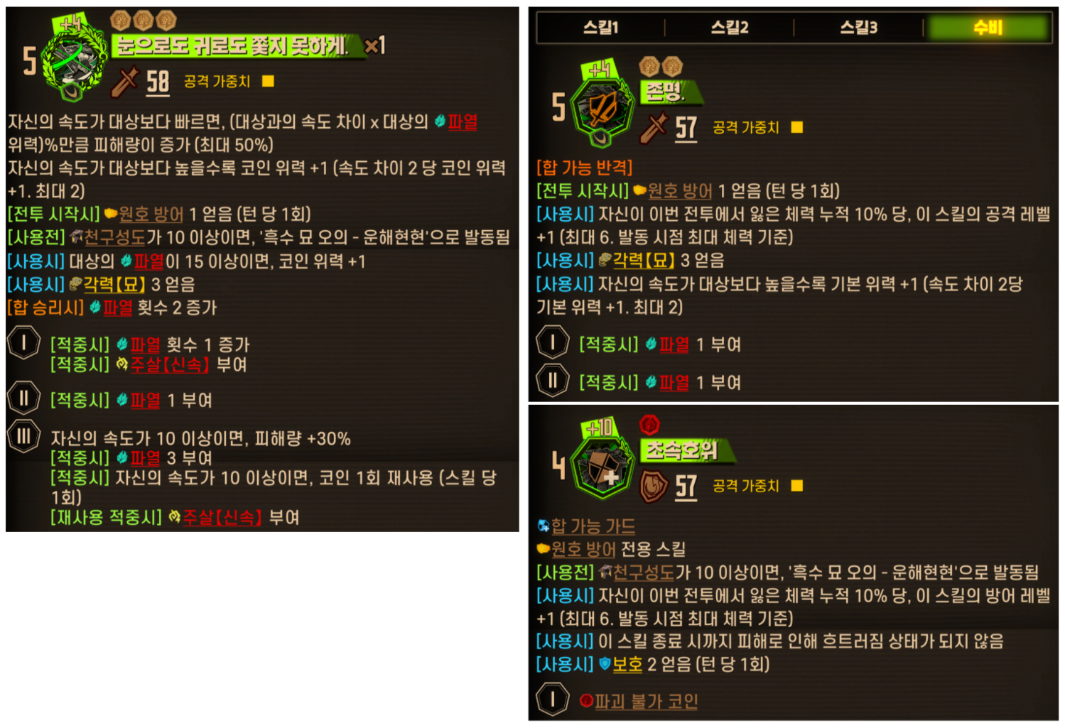 | 1. 천구성도 5를 모으기 | - 속도 10 이상에서 3스킬 사용 = 천구성도 +6 - 원호방어 발동 = 천구성도 +5 |